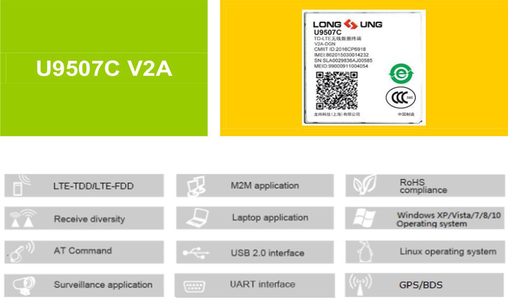 在 LTE-TDD/LTE-FDD 制式下,U9507C V2A 上下行速率可以达到 50Mbps 和 150Mbps,在没有 LTE 覆 盖的情况下,U9507C V2A 还可以可靠安全地注册到 3G(TD-SCDMA/UMTS/EVDO)或 2G (EDGE/GPRS/CDMA)网络。